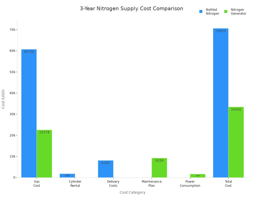 Many facilities recover the initial investment in a PSA nitrogen generator in less than two years. Over time, users can save up to 80% on nitrogen costs, making PSA systems a smart financial choice. The following table shows a cost comparison over three years for one LC-MS instrument: